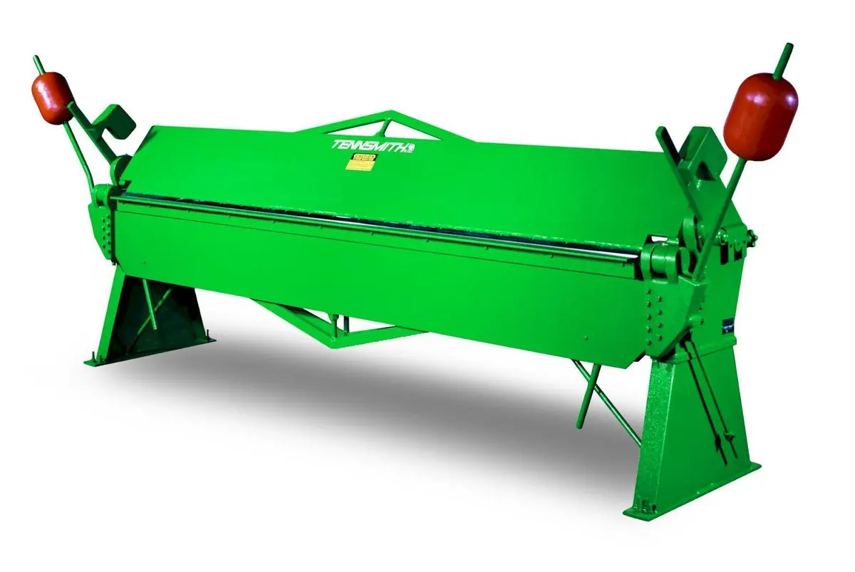 TENNSMITH HEAVY-DUTY HAND BRAKES ARE DESIGNED AND BUILT FOR LONG SERVICE AND ACCURATE BENDING. WELDED STEEL PLATE CONSTRUCTION AND HEAVY TRUSS RODS AND BRACES PROVIDE STENGTH AND DURABILITY. WITH MUCH MORE SUBSTANTIAL STEEL SIDE PLATES THAN OTHER DOMESTICALLY MADE UNITS, THESE BRAKES HAVE THE RIGIDITY REQUIRED FOR UPPER LEAF ADJUSTMENT WITHOUT THE USE OF WRENCHES. EQUIPPED WITH THRUST BEARINGS, THE UPPER LEAF ADJUSTMENT SCREWS PERMIT QUICK, ACCURATE ALIGNMENT FOR DIFFERENT MATERIAL THICKNESSES OR RADII. OTHER ADJUSTMENT FEATURES INCLUDE: LEVELING SCREWS AND LOCK NUTS ON THE PEDESTALS - JACK SCREWS AND TENSIONER BOLTS ON THE APRON -TRUSS RODS ON THE APRON, BASE AND UPPER LEAF - AND FULLY ADJUSTABLE COUNTER BALANCES TO FACILITATE THE BENDING PROCESS. REMOVABLE APRON ANGLE AND INSERT PERMIT 1/4-INCH REVERSE BENDS IN LIGHTER MATERIAL. BORED IN-LINE TO ENSURE PERFECT ALIGNMENT, THE PIVOT POINTS ARE FITTED WITH OIL IMPREGNATED BEARINGS. THE HINGE PINS ARE HIGH-TENSILE, ALLOY STEEL. DUCTILE STEEL CLAMP HANDLES, HEAVY YOKES, GREASE FITTINGS, AND AN APRON STOP ROD COMPLEMENT THE MANY OTHER FINE FEATURES OF THESE HEAVY-DUTY BRAKES.