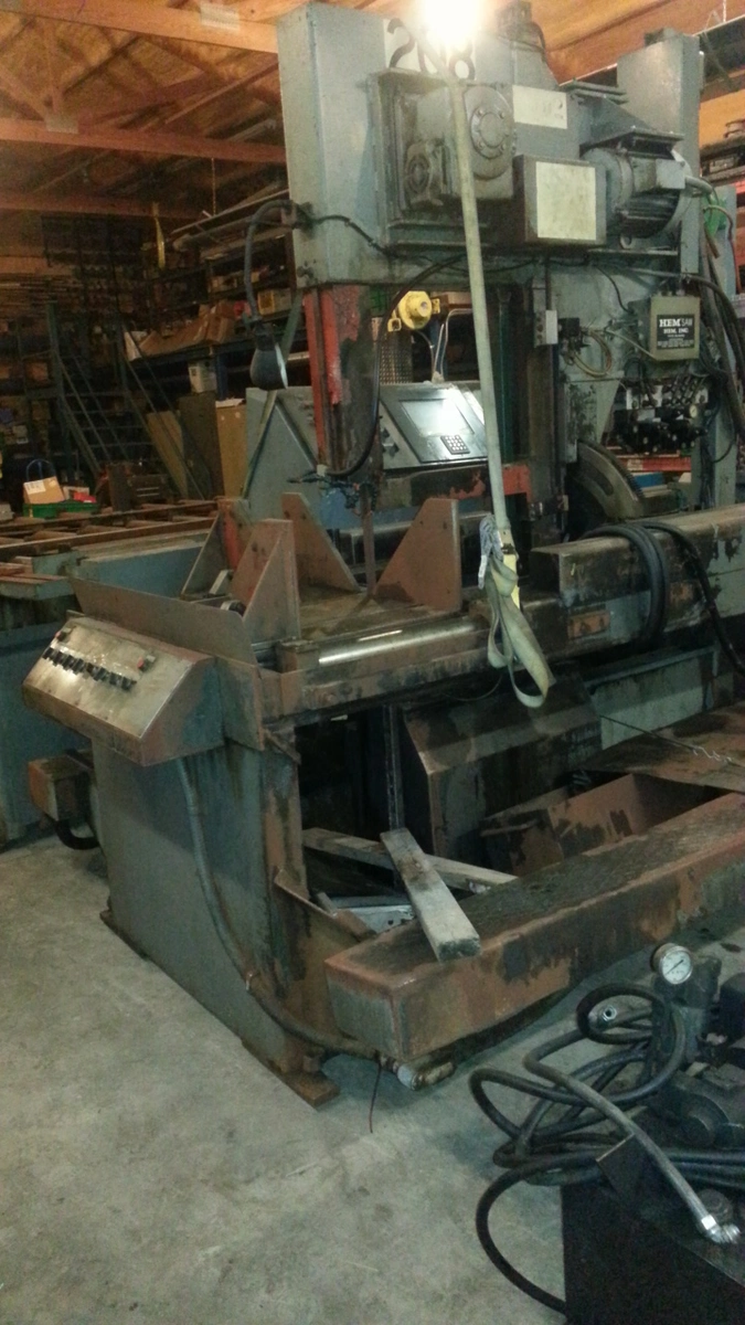 CONTROL: Control station is free standing and controls all hydraulic and electrical functions, adjustable clamping pressure, adjustable cutting pressure, feed traverse, power tilt, motor, blade speed LED readout, material clamp, coolant system, powered moveable guide arms, chip conveyor system, cut watcher, blade speed faster/slower and power on/off.