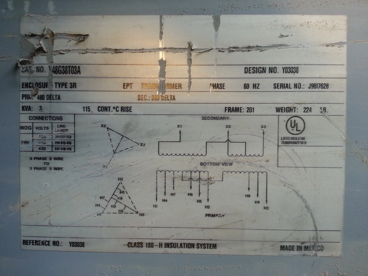 (1) PREOWNED CUTLER HAMMER, 3 PHASE TRANSFORMER, 3 KVA,